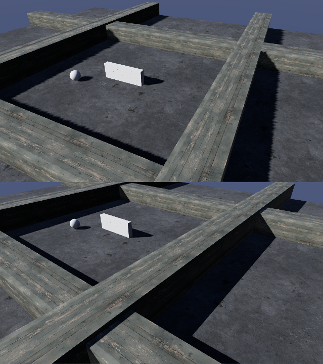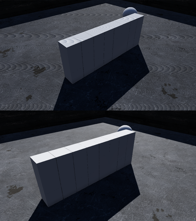 It’s frustrating when introducing a fix for one thing breaks something else. That’s exactly what we can potentially end up with when we use depth biases for shadow maps. Peter Panning is caused by offsetting the depth values in light space too much. The result is that the shadow becomes detached from the object casting it. The image below displays this phenomenon. In both halves of the image, the blocks are resting on the ground, but in the top half the depth bias is so large that it pushes the shadow away from the caster, causing them to appear as though they could be floating. The bottom half uses a more appropriate depth bias and the shadow appears properly attached.