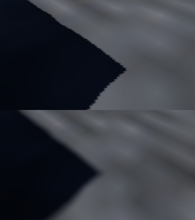 Unfortunately, increasing the resolution will only get us so far. Even at high resolutions, if the viewer is close enough to the receiving surface, tiny stair-like artifacts will still be noticeable along the edges of projected shadows. The solution to this is to use a technique called percentage closer filtering (PCF). Instead of sampling at one location, this algorithm samples several points around the initial location, weighs the results that are shadowed versus non-shadowed, and creates soft edges for the result. The image below shows an up-close view of a shadow map with 2048x2048 resolution without and then with PCF enabled.