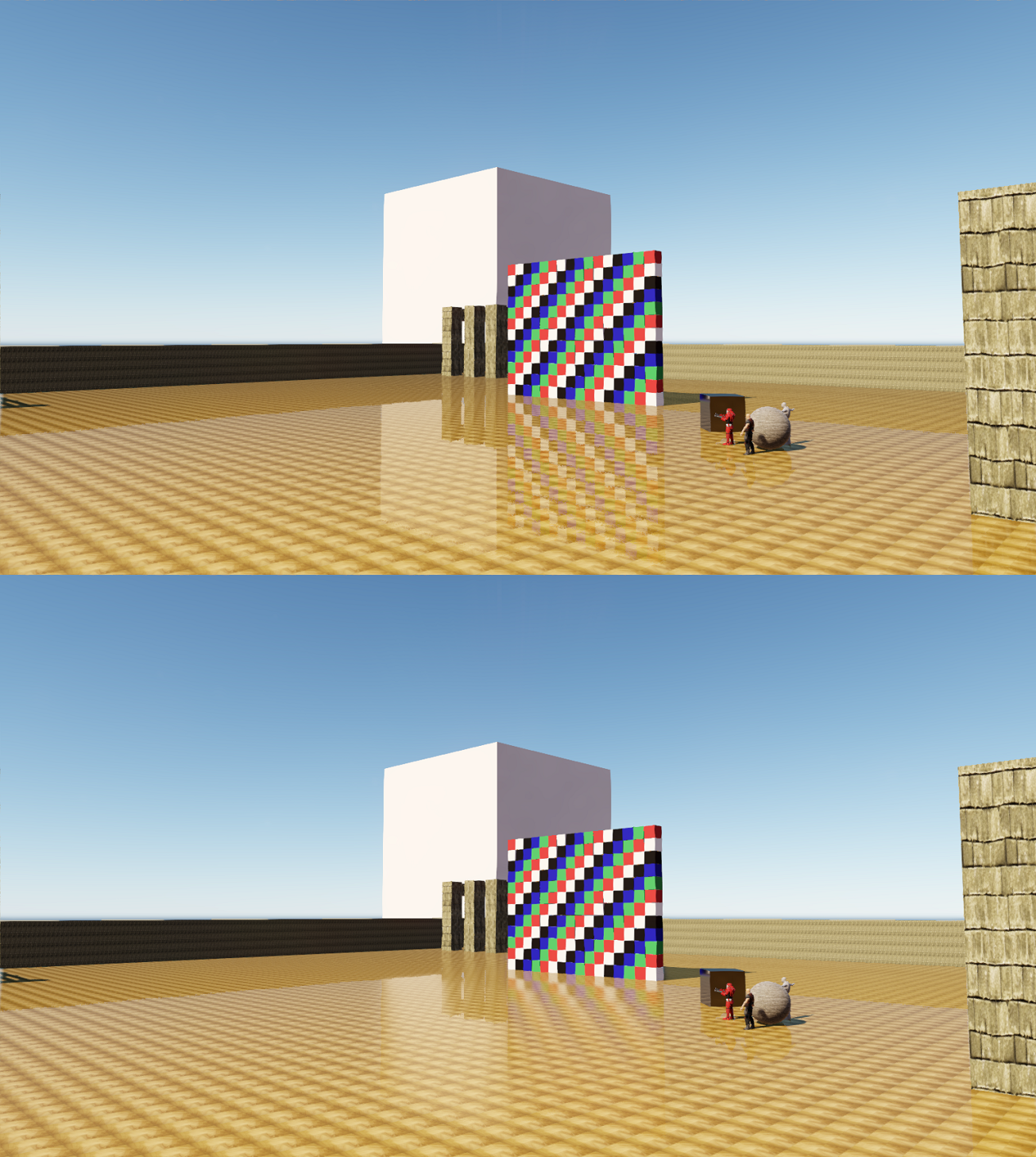 The first image shows the effect working on a large scale in an area of the scene spanning over 100 meters.