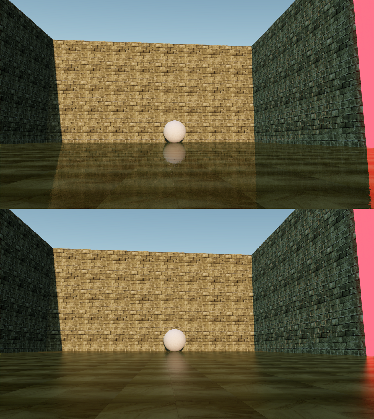 It’s mentioned earlier that a fallback technique is useful for any screen space reflection technique. This implementation uses parallax-corrected cube maps based on Lagarde’s post [4]. These also include a fallback to generic, non-corrected cube maps as a last resort. These values are all computed before the screen space reflections technique starts and are accessed above in the cone tracing step through the “indirectSpecularBuffer” resource. While fallback methods won’t be as exact as ray traced results, properly set-up cube maps can certainly help alleviate jarring artifacts. The image below shows a comparison of two sections of the same scene. The left half of the image does not have good cube map placement and the missed reflection data is quite noticeable under the sphere. The right half includes blended parallax-corrected cube maps and introduces a much less severe penalty for missed rays.